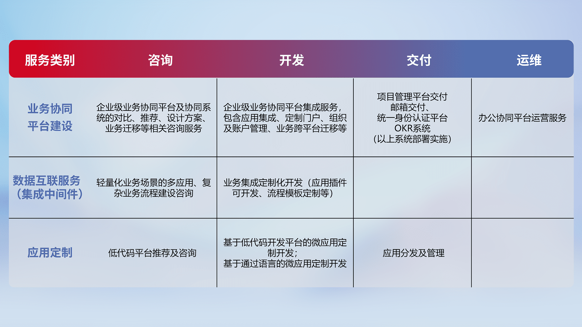 针对钉钉、、、企微、、、IDaas等平台级产品提供产品的规划、、方案、、、交付、、、定制化开发等服务,,,,实现如统一协同办公、、智能客户服务、、、、混合会议管理、、智能数据查询、、、、等业务场景,,,实现数字化转型。。。