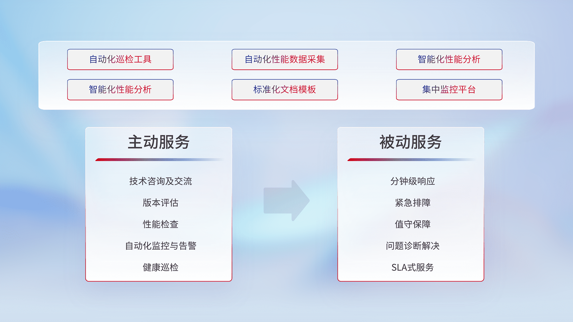 智能化工具和标准化文档,,,,保障服务质量,,,,提供主动服务(包含技术咨询、、版本评估、、、性能检查、、、自动化监控与告警、、、、健康巡检)和被动服务包含(分钟级响应、、紧急排障、、、、值守保障、、、问题诊断解决、、SLA服务)。。。。